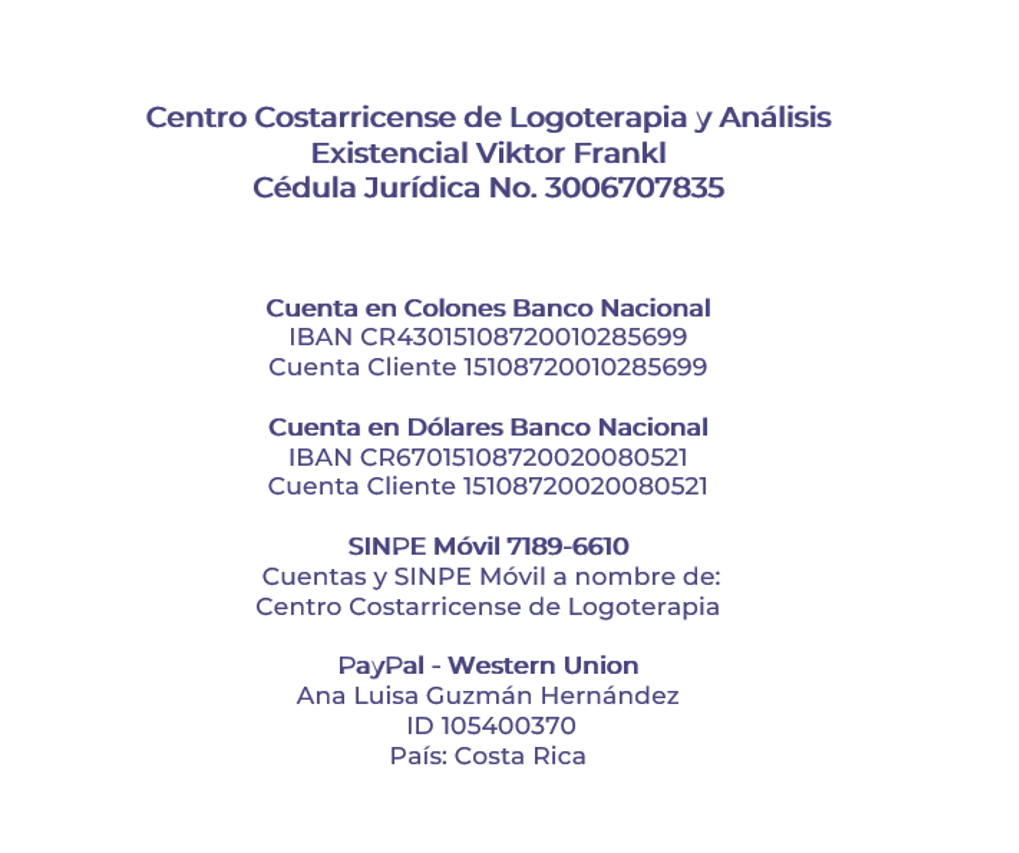 7189-6610 a nombre de: Centro Costarricense de Logoterapia