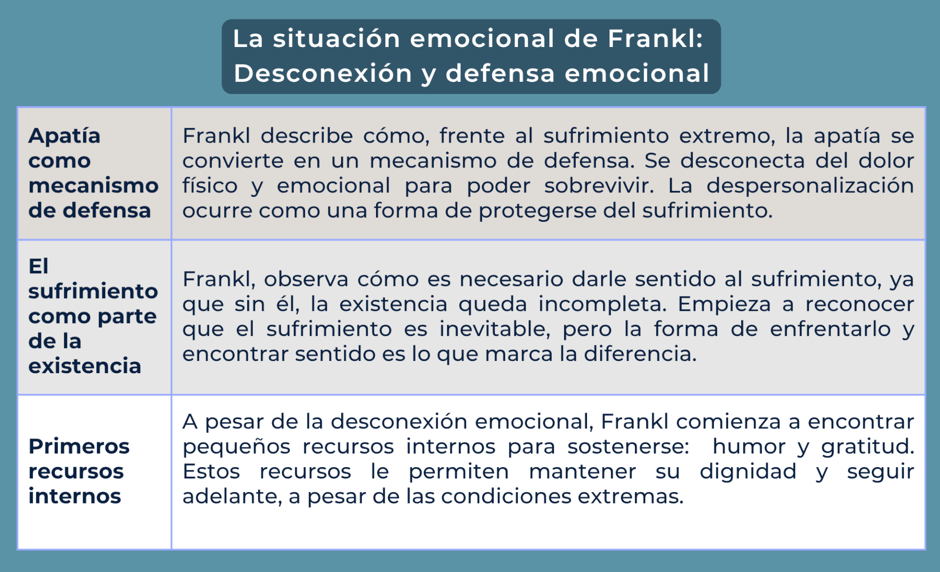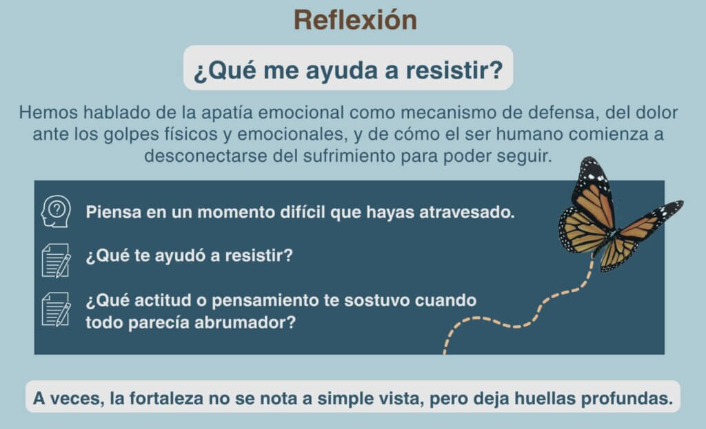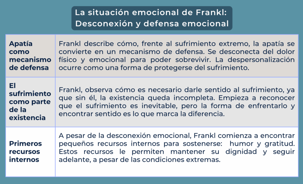 Desde la Logoterapia esta apatía, es una forma de autodefensa ante el sufrimiento extremo. Esta falta de sensibilidad emocional les ayuda a lidiar con el dolor y la desesperanza, permitiéndoles centrarse en lo esencial, la supervivencia. Frankl observa cómo, a pesar de los golpes y el sufrimiento, los prisioneros se esfuerzan por conservar sus vidas y las de sus compañeros cuando dicen, bueno, ya pasó el día. Esto refleja una pequeña victoria diaria, que les da un respiro en medio del horror. Esta búsqueda de significado, incluso en los momentos más difíciles, es fundamental para mantener la esperanza y la dignidad.